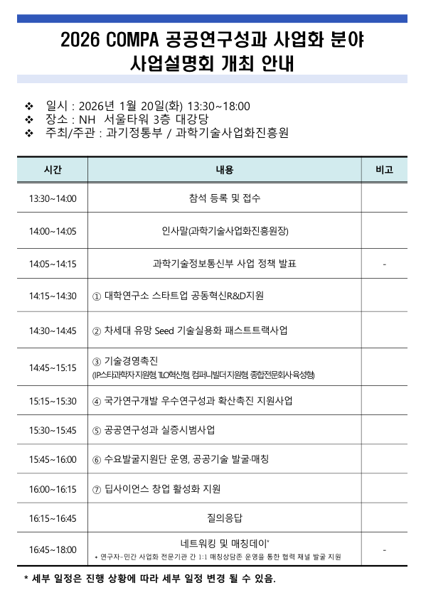 과학기술정보통신부와 과학기술사업화진흥원에서는 금년 진행될 신규 사업에 대해 사업 참여를 희망하는 분들을 대상으로 2026년 공공연구성과 사업화 분야 사업설명회를 실시하고자 하오니, 관심 있는 분들의 많은 참여 부탁드립니다.