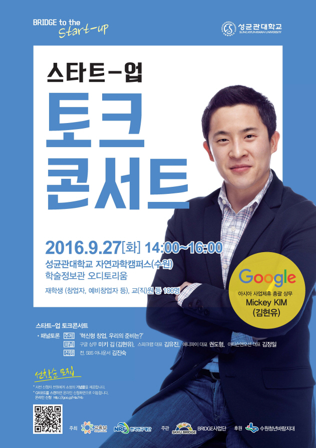 이날 토크콘서트에는 구글 유일의 한국인 상무 Mickey Kim(김현유)를 비롯하여 국내 최고의 액셀러레이터, 스타트업 창업자, 학생창업자 등 혁신창업의 대표주자들에게 교내 창업희망 대학(원)생들이 직접 질문을 던지고 자유로운 소통을 하는 자리가 마련될 예정입니다.