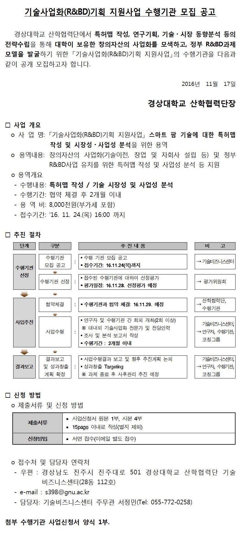[경상대학교] 기술사업화(R&BD)기획 지원사업 수행기관 모집 공고
