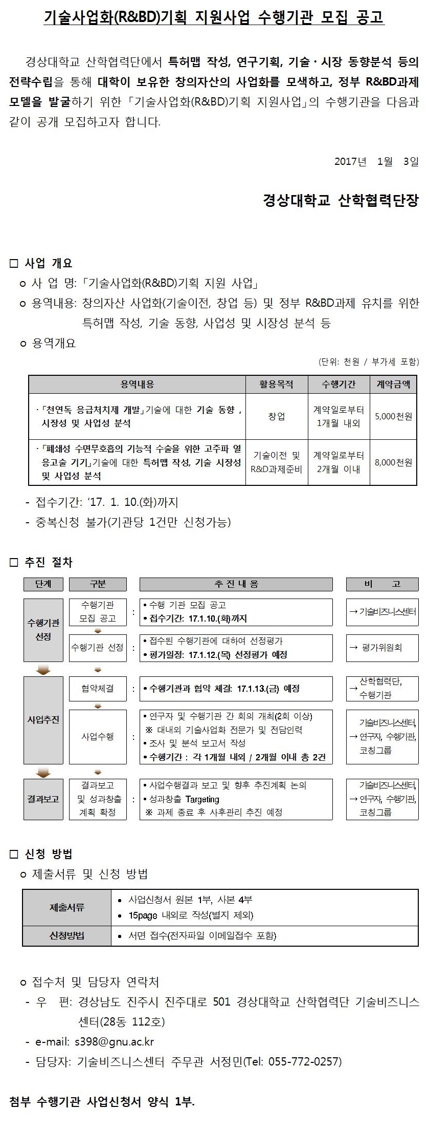 [경상대학교] 기술사업화(R&BD)기획 지원사업 수행기관 모집 공고