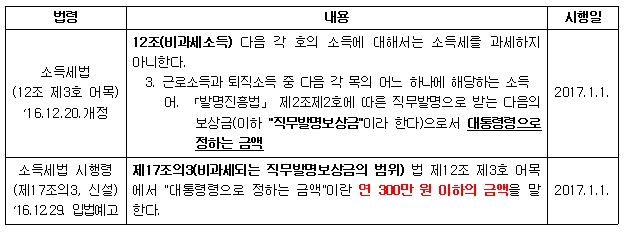 「소득세법에 따른 직무발명보상금의 비과세 한도」가 아래와 같이 신설되는 것으로 입법예고 되었습니다.