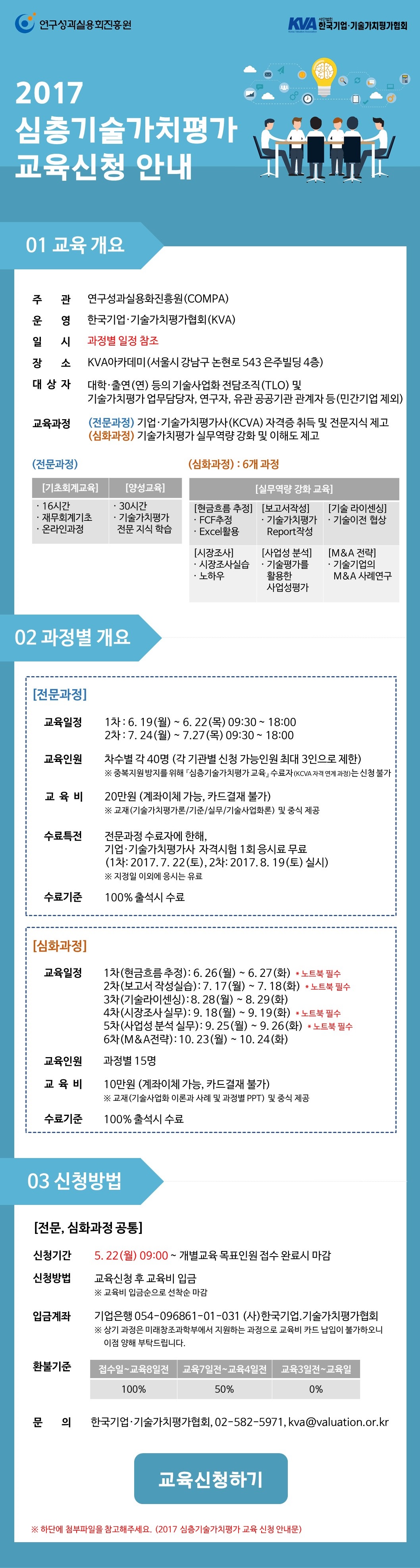 기업.기술가치평가사(KCVA) 및 기술가치평가 심화과정으로 구성되어 있어, 기술가치평가 및 기술사업화 역량 강화에 좋은 기회이오니 관심있는 분들의 많은 신청 부탁드립니다.