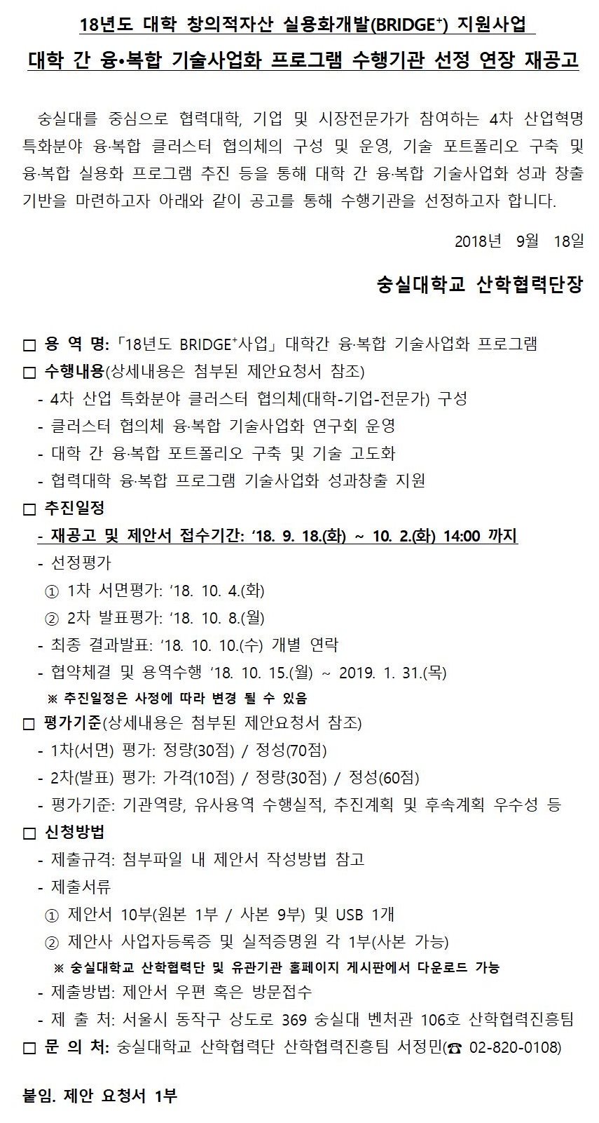 [연장공고]숭실대학교 대학 간 융복합 기술사업화 프로그램 수행기관 선정 공고