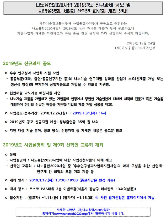 나노융합2020사업단 신규과제 공모, 사업설명회 및 산학연 교류회 개최 안내