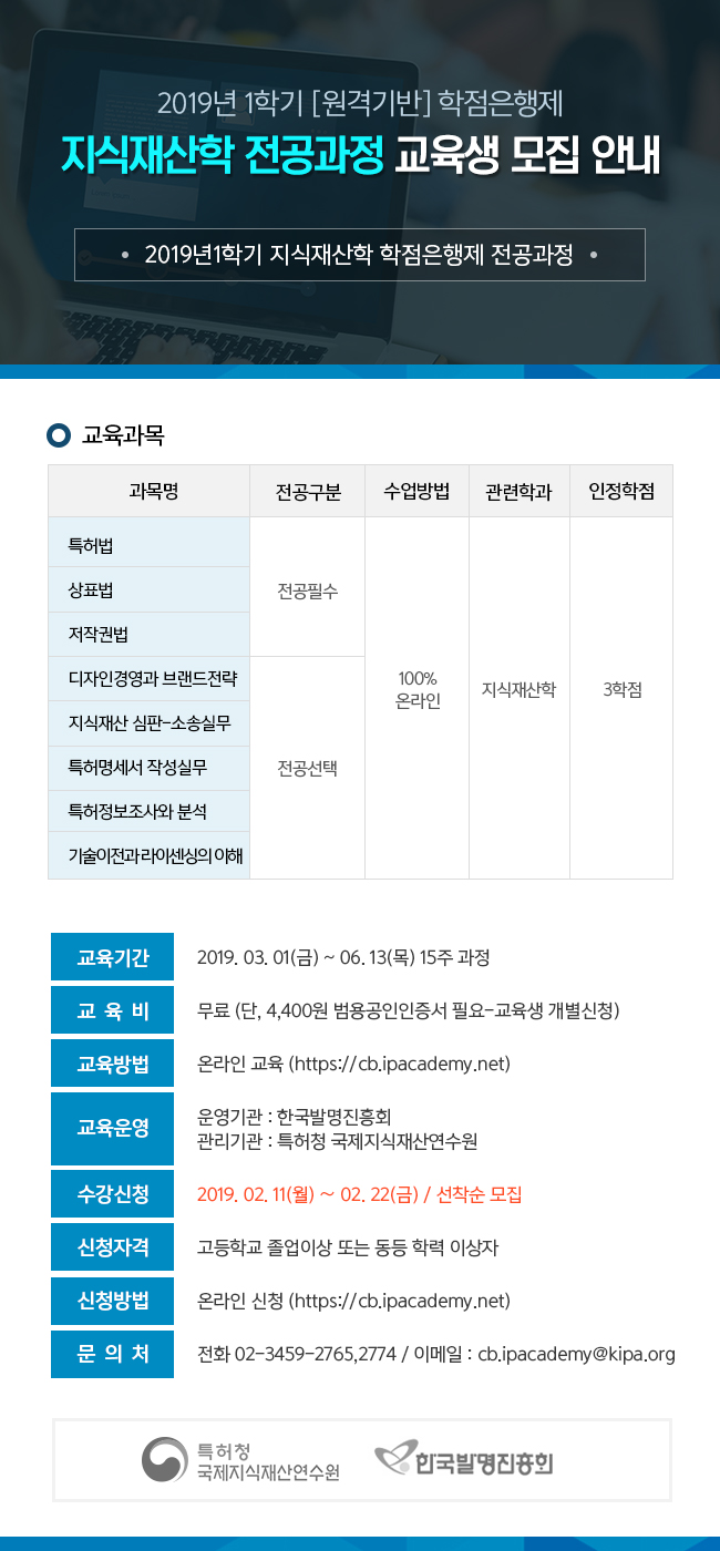 [무료교육] 2019년 제1학기 지식재산학 학점은행제 교육생 모집 안내