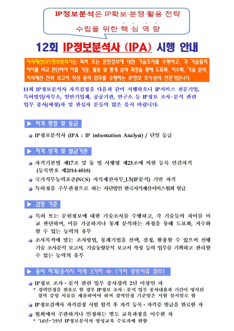 정시 12회 IP정보분석사(IPA) 자격검정 시행 안내