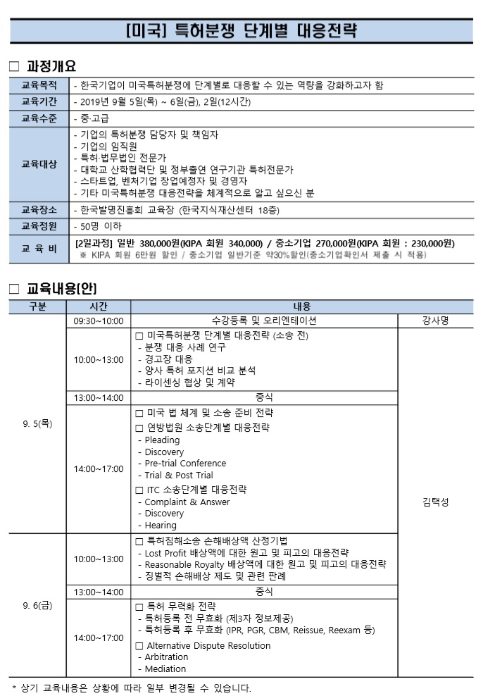 (9월 첫주 IP교육 신청) 미국 특허분쟁 단계별 대응전략