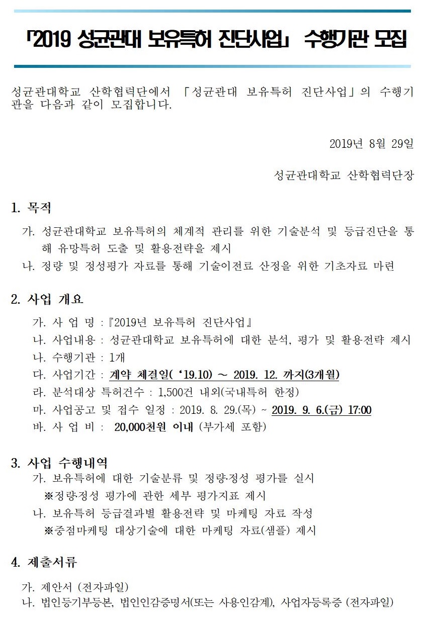 [성균관대] 2019년 성균관대 보유특허 진단사업 수행기관 모집공고