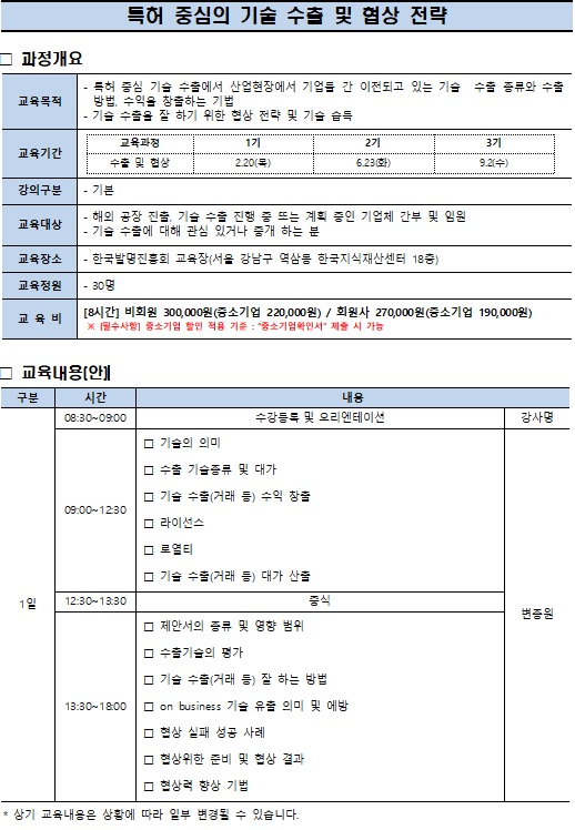"특허 중심의 기술 수출 및 협상 전략" 교육신청 안내