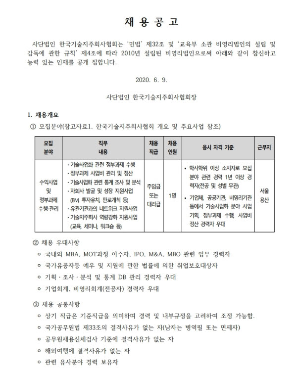 [한국기술지주회사협회] 계약직 직원 채용 공고(~2020.06.19 18:00)