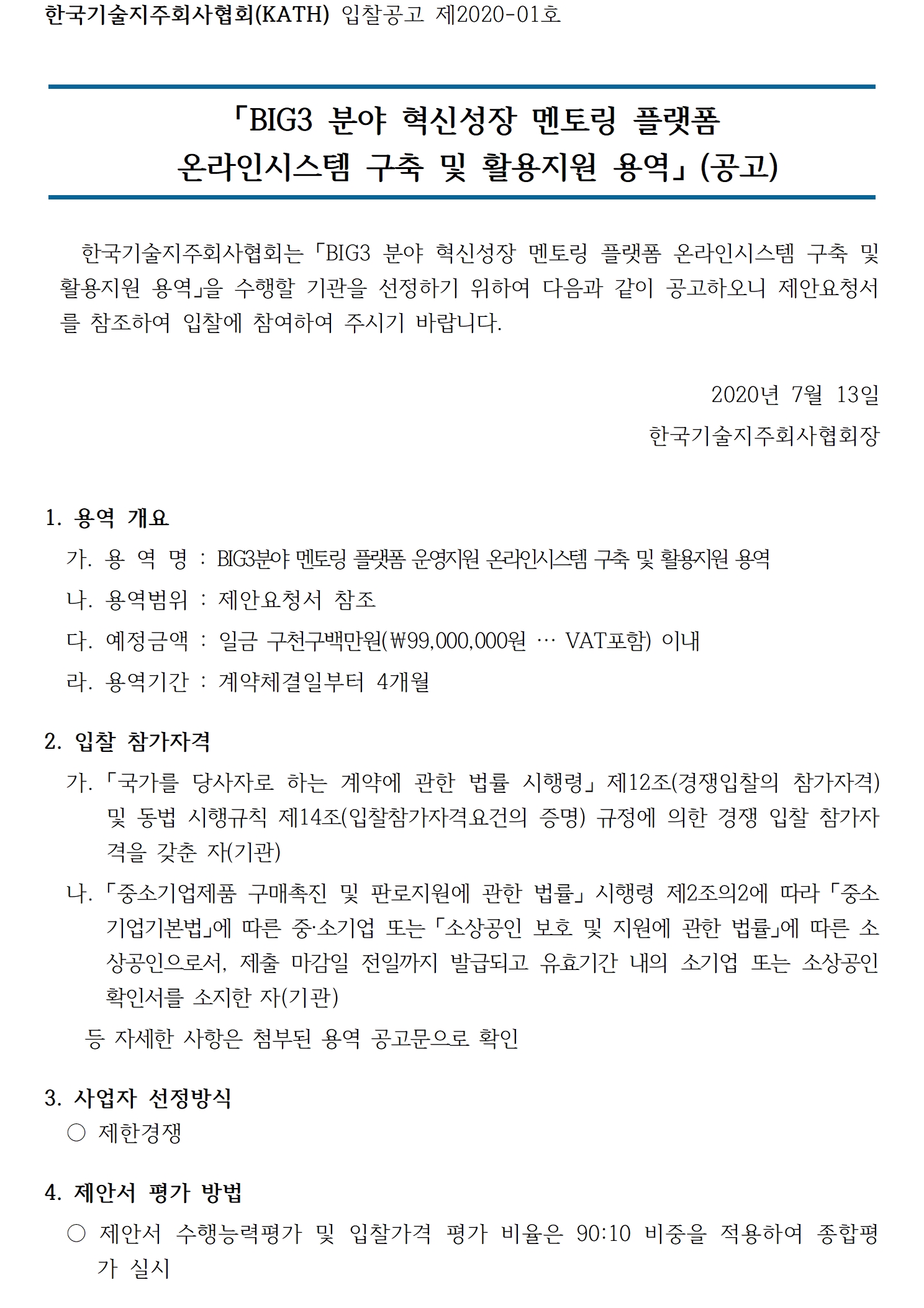 [한국기술지주회사협회]「BIG3 분야 혁신성장 멘토링 플랫폼 온라인시스템 구축 및 활용지원 용역」 공고