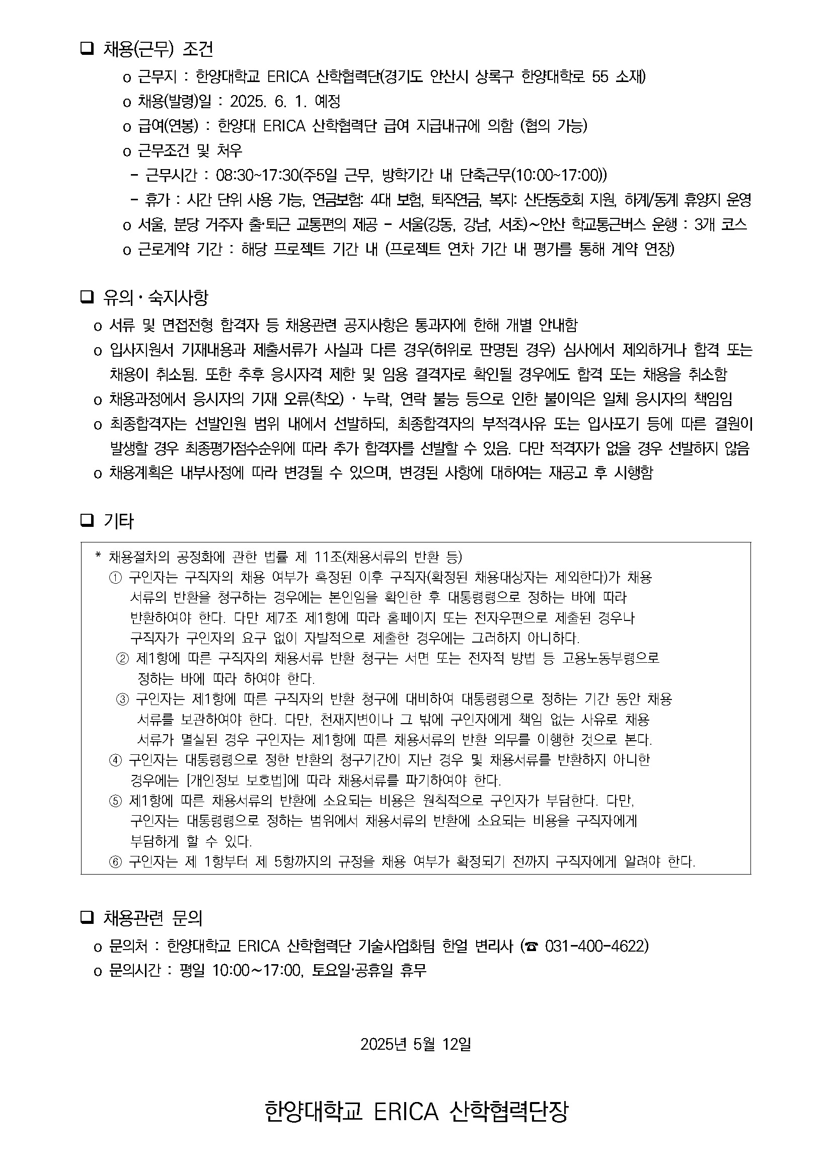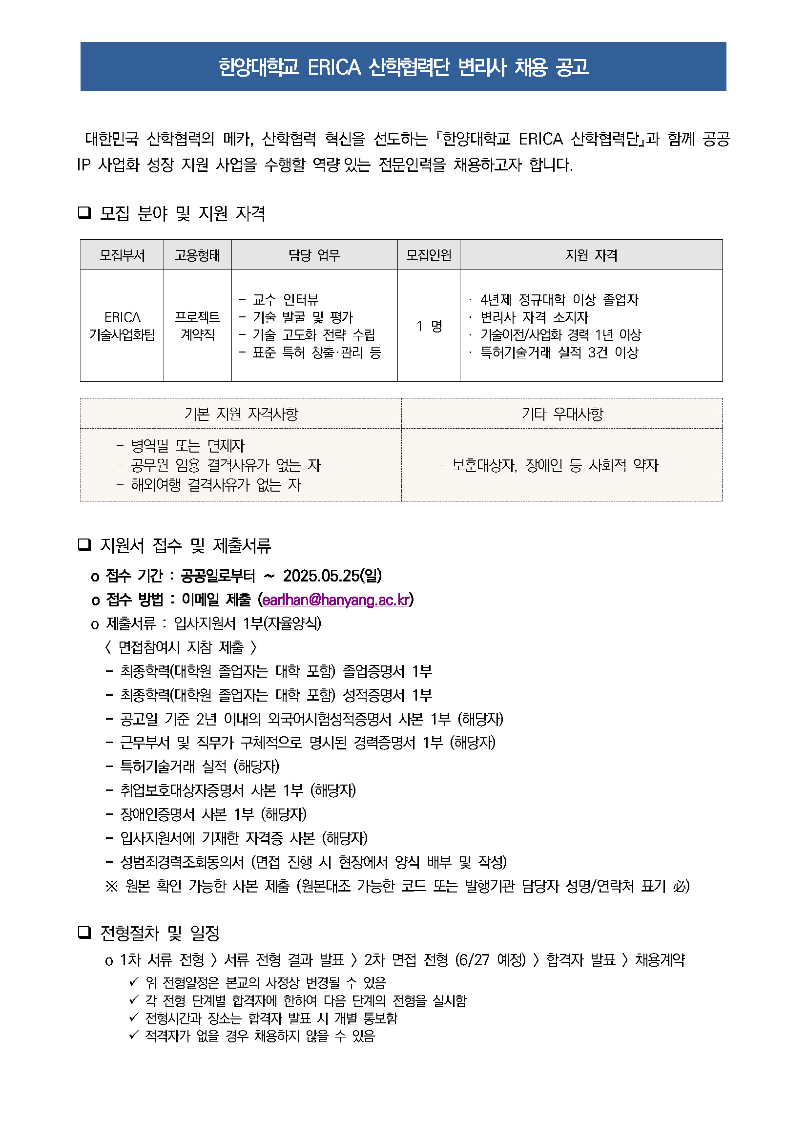 한양대학교 ERICA 산학협력단 변리사 채용 공고