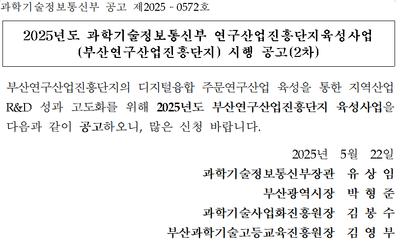 [과학기술정보통신부 공고 제2025–0572호] 2025년도 과학기술정보통신부 연구산업진흥단지육성사업 (부산연구산업진흥단지) 시행 공고(2차)