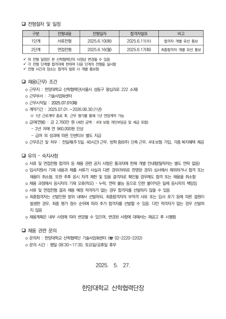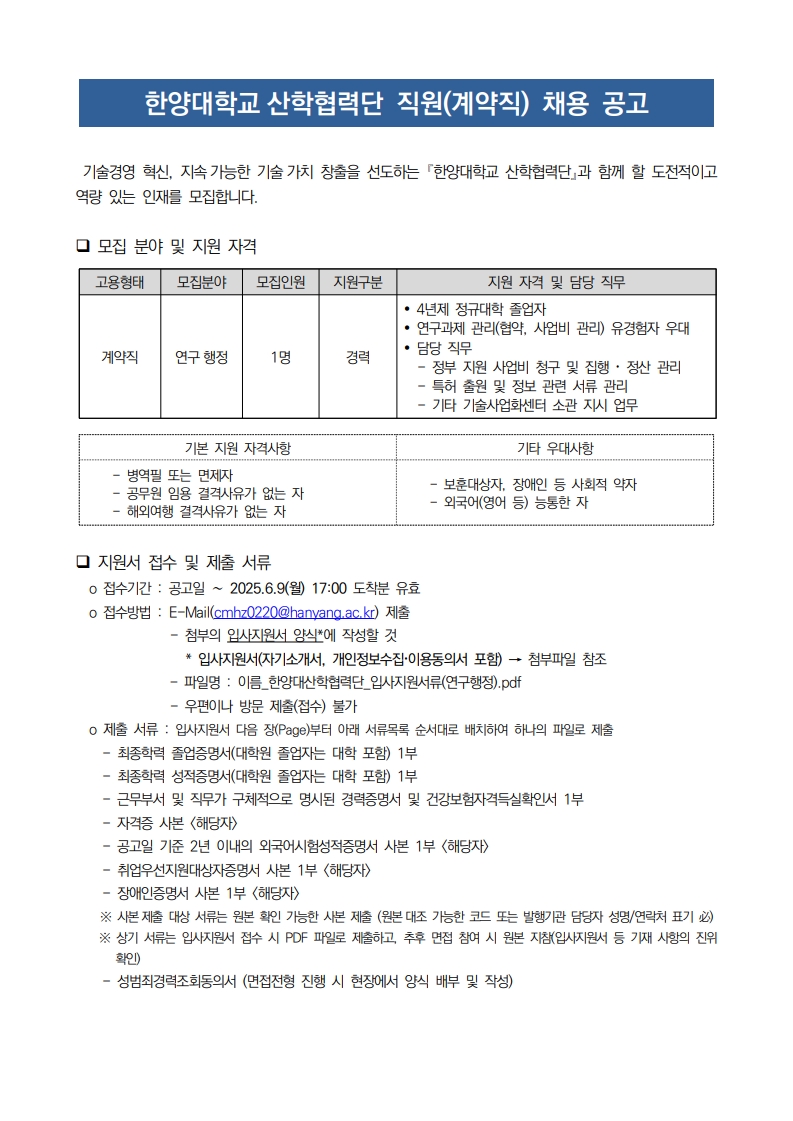 [한양대학교 산학협력단] 기술사업화센터 직원(계약직) 채용
