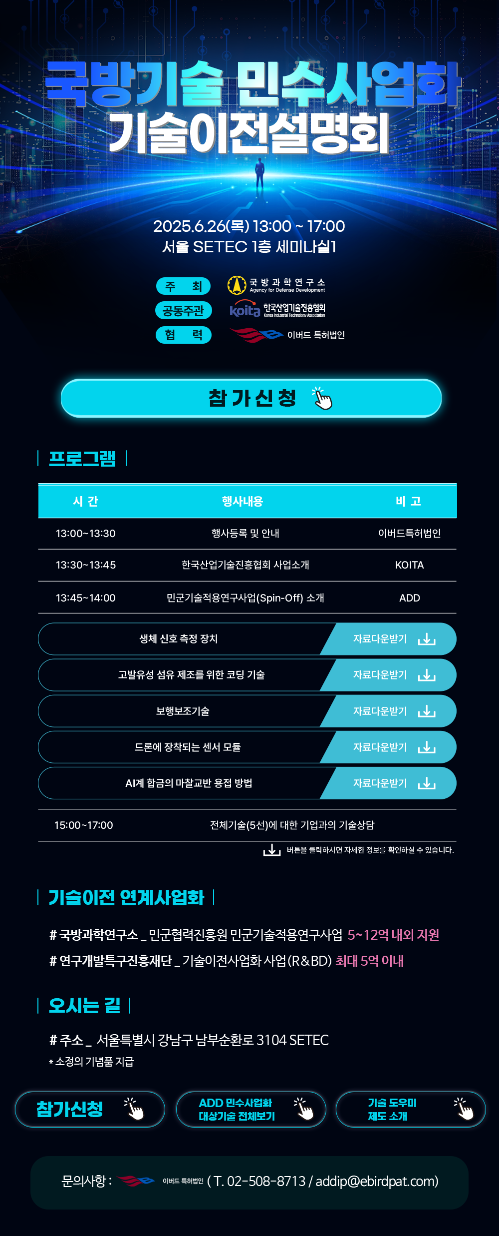 아래와 같이 6월 26일 국방과학연구소 국방기술 민수사업화 기술이전설명회가 진행됩니다.