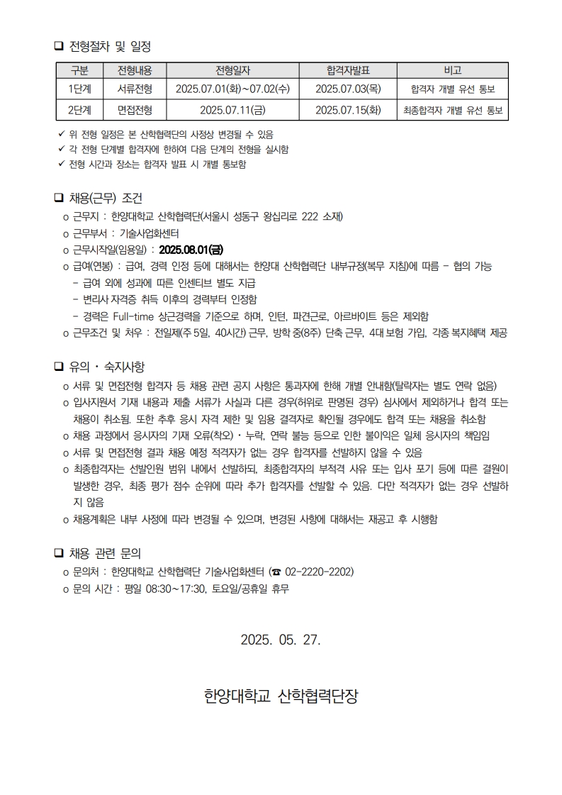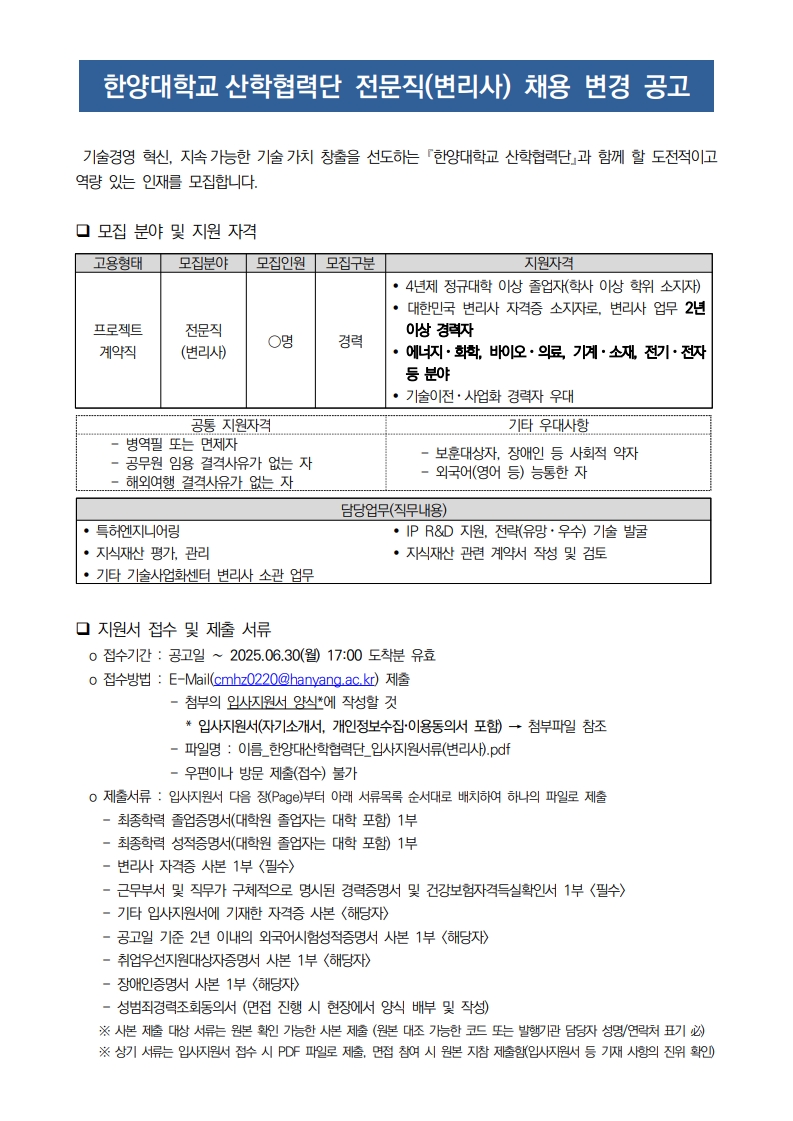[한양대학교 산학협력단] 기술사업화센터 전문직(변리사) 채용 공고