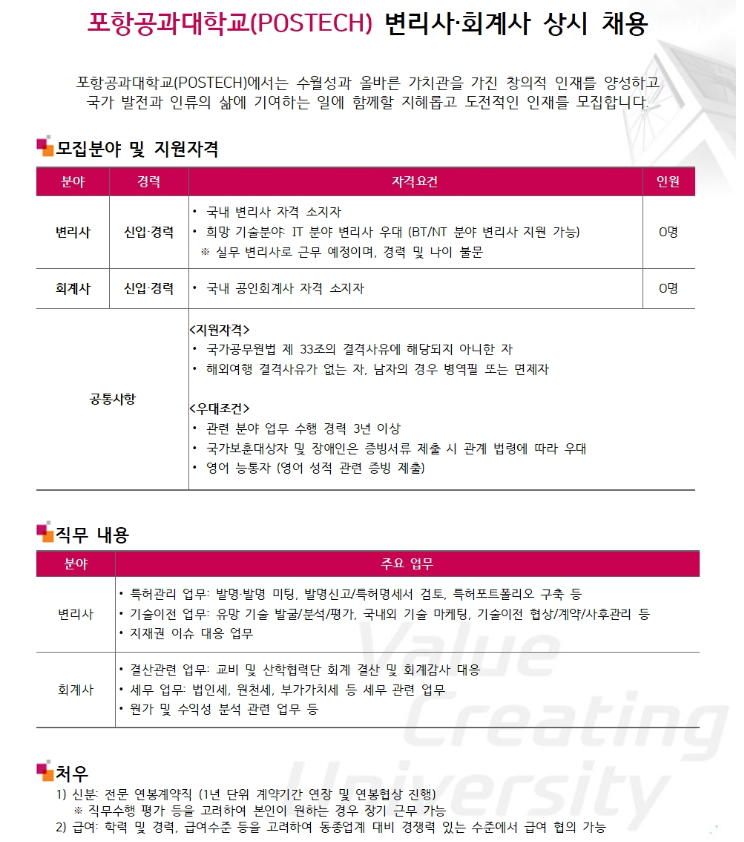 * 실무 및 연봉등 관련 문의는 기술사업화팀 배영훈 팀장(변리사)(054-279-8481, simple@postech.ac.kr)에 문의