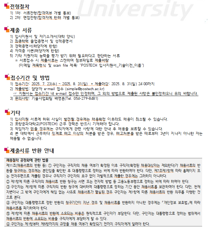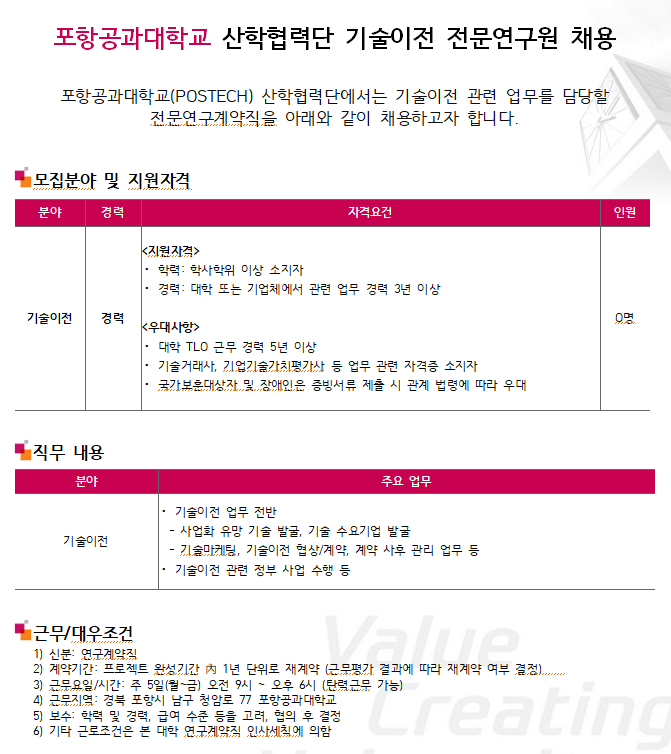 [포항공대 산학협력단] 2025년 기술이전 전문연구원 채용 공고