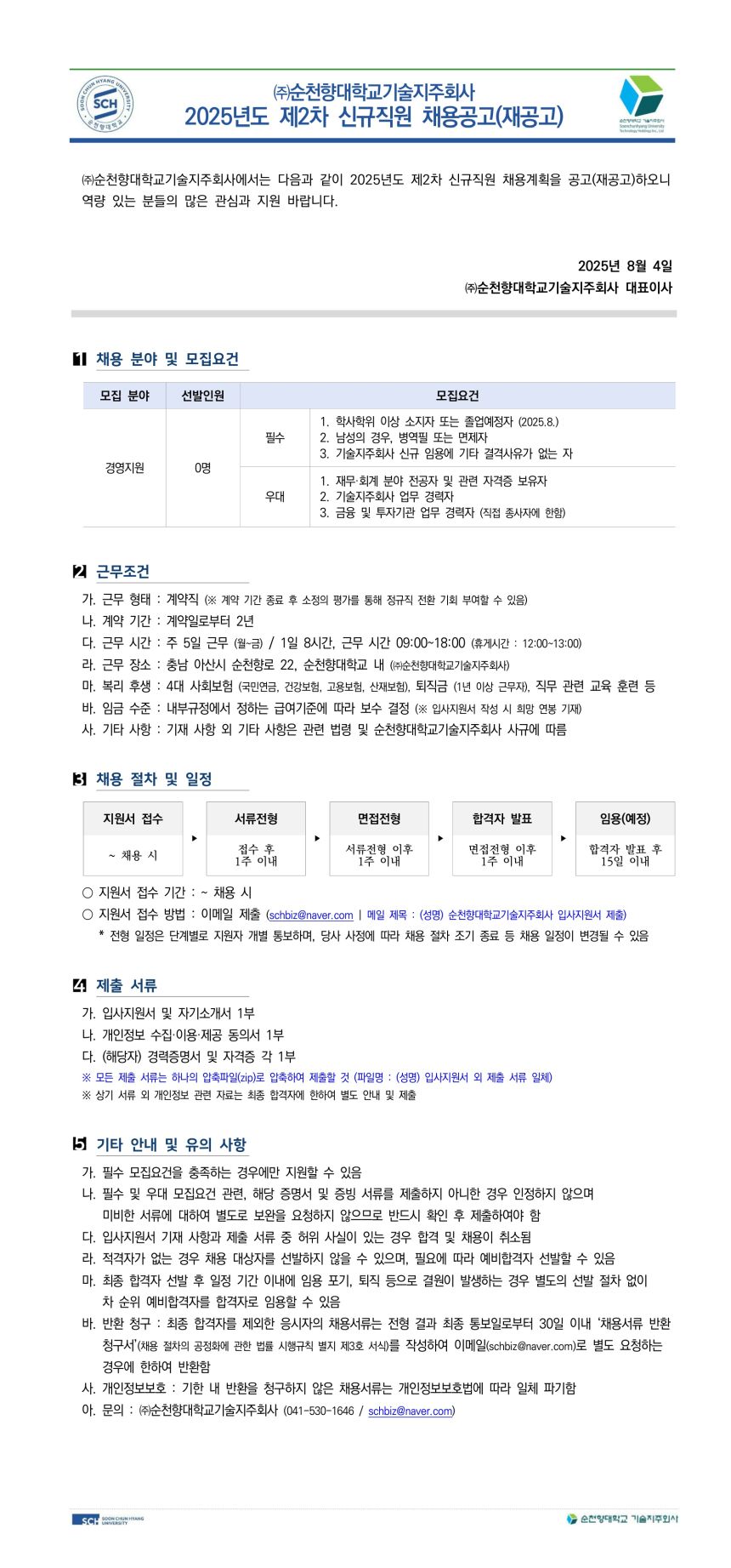 [㈜순천향대학교기술지주회사] 2025년도 신규직원 채용공고(재공고)
