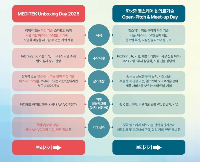 메디테크 조직위원회는 의료분야의 혁신 기술을 발굴하고 사업화 역량을 강화할 수 있는 '2025 MEDITEK'의 프로그램인 'MEDITEK Unboxing Day 2025' 와 '한×중 헬스케어 & 의료기술 Open-Pitch & Meet-up Day'의 참가기업을 모집한다고 12일 밝혔다.