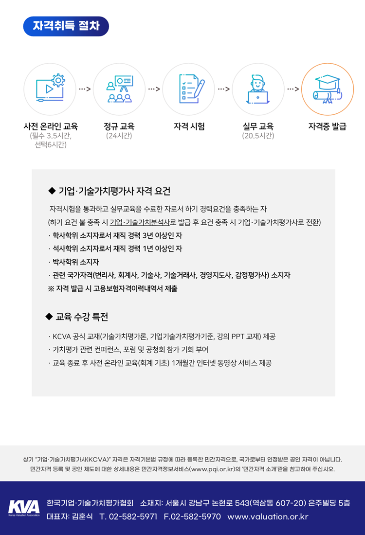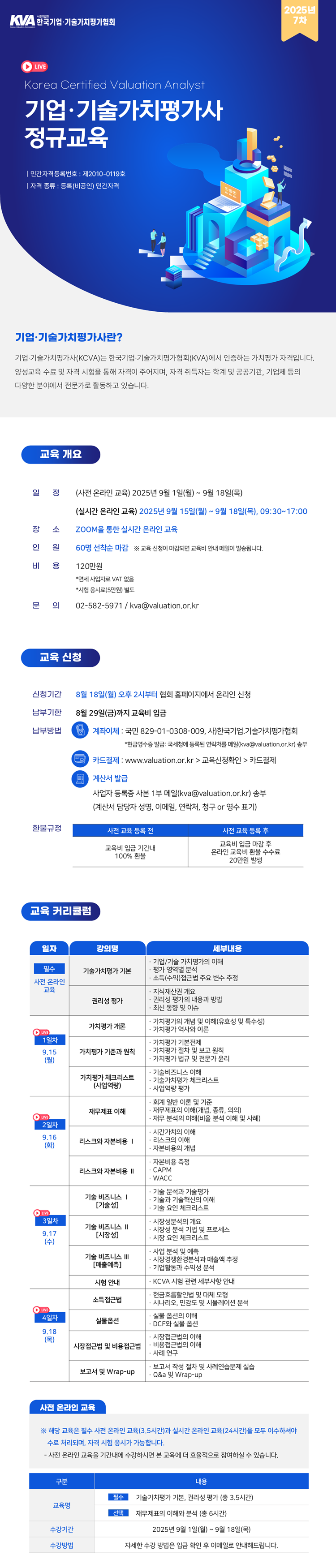 2025년 제7차 기업·기술가치평가사(KCVA) 정규 과정을 아래와 같이 운영하오니,관심 있는 분들의 많은 참여를 부탁드립니다.
