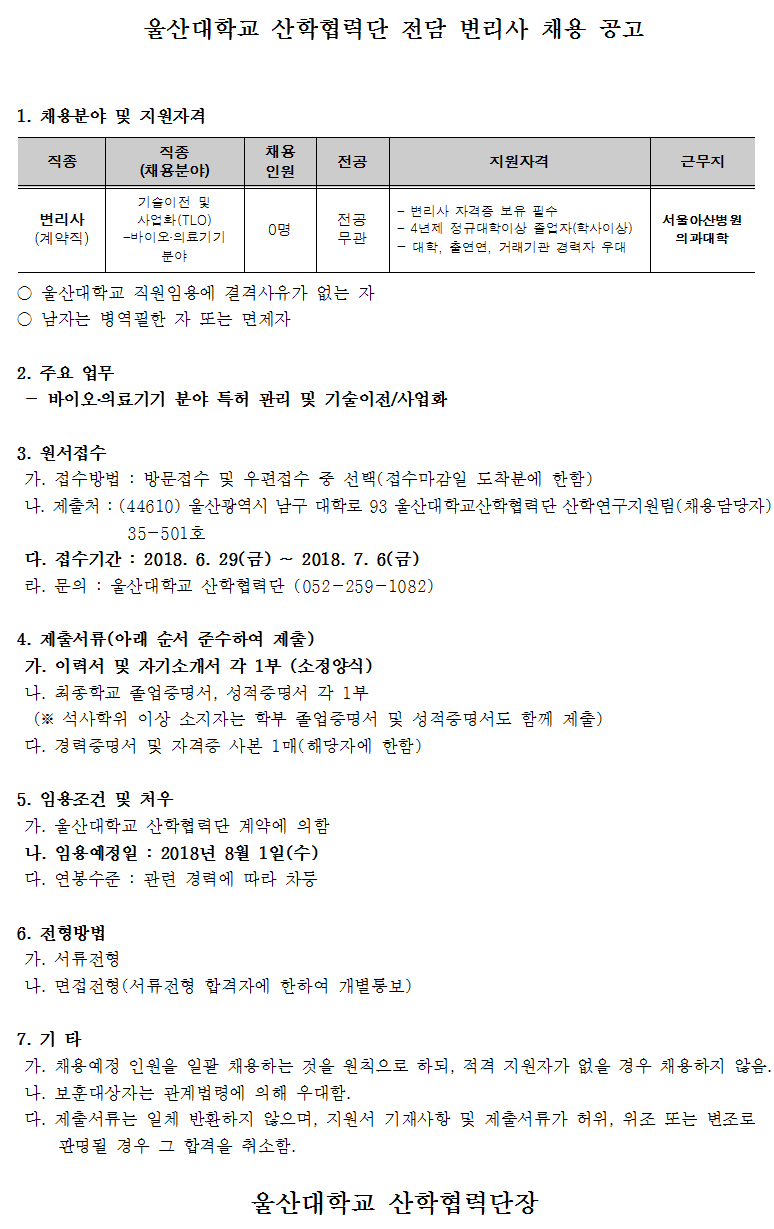 울산대학교(서울아산병원 근무) 전담변리사 채용 공고
