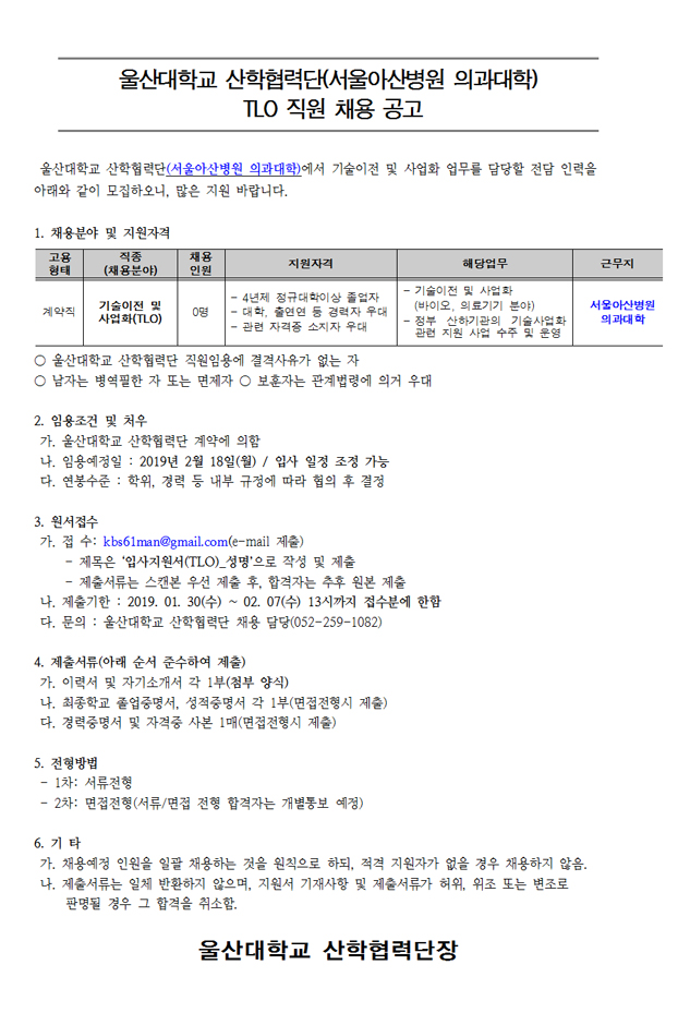 [울산대 산단(서울아산병원 근무)] TLO 직원채용 공고
