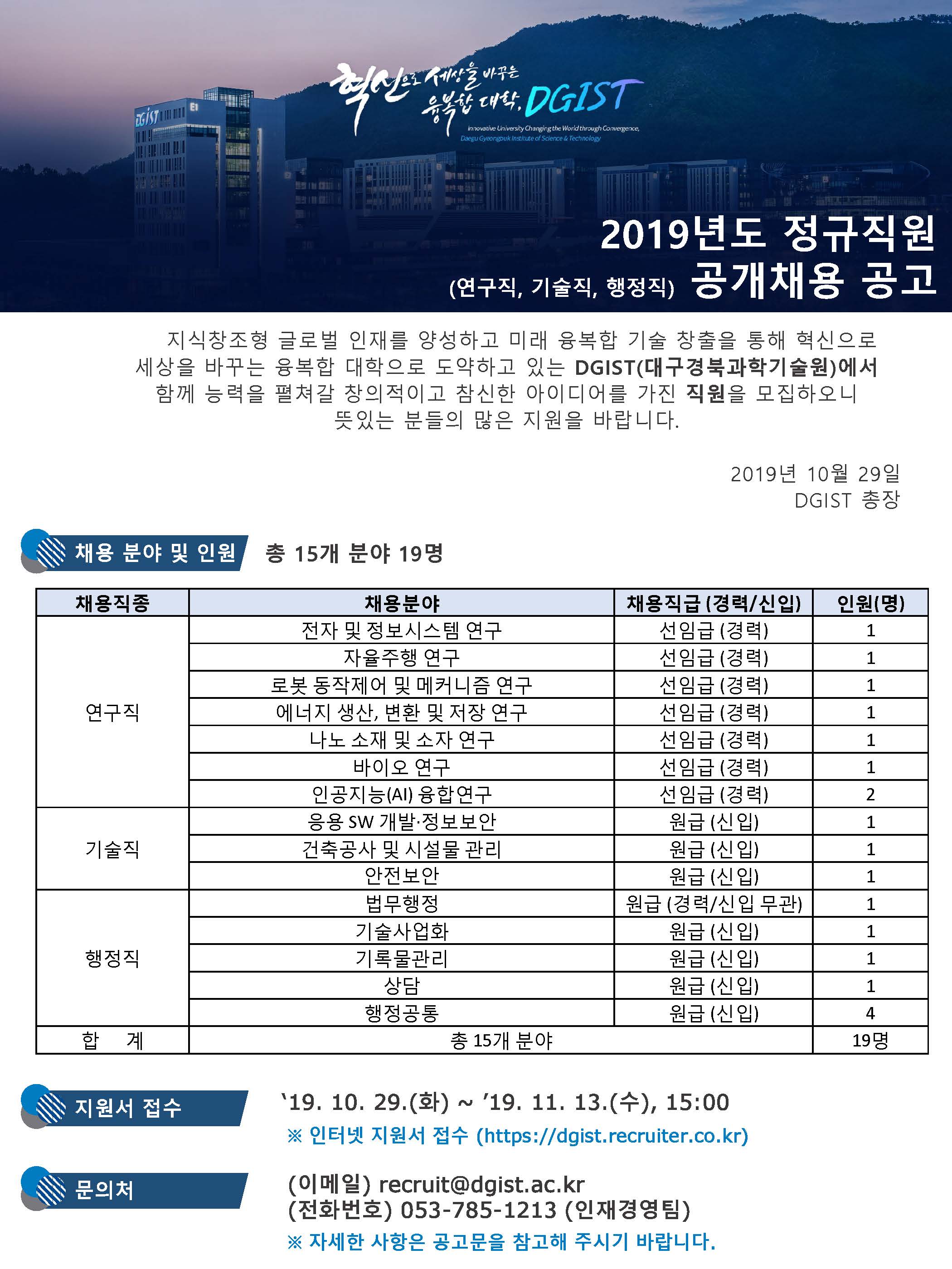 기술사업화 분야 인력채용을 포함하는 2019년도 정규직원 공개채용 공고가 게시되어 안내드립니다