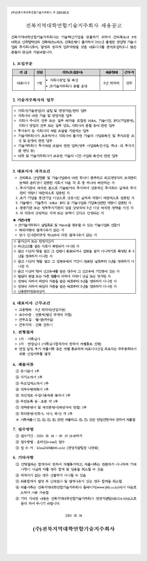 전북지역대학연합기술지주회사 대표이사 채용공고