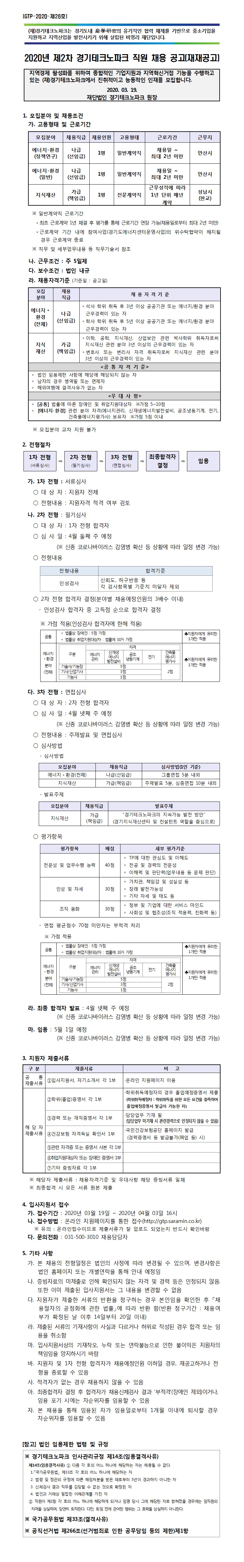 2020년 제2차 경기테크노파크 직원 채용 공고(재재공고)