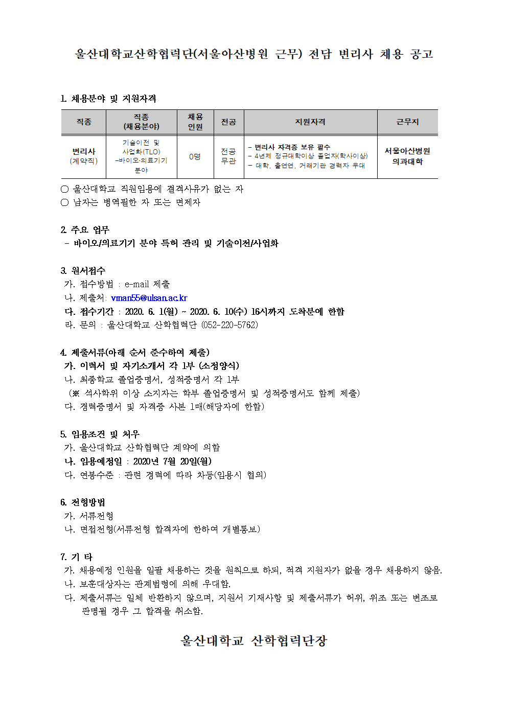 울산대학교 산학협력단 (서울아산병원 근무) 전담 변리사 채용 공고