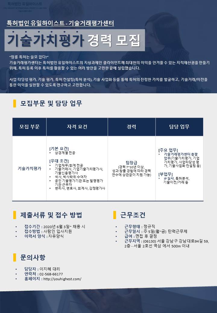[특허법인 유일하이스트]기술거래평가센터 기술가치평가 경력직 모집 합니다.