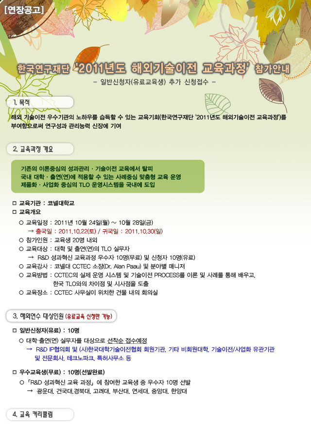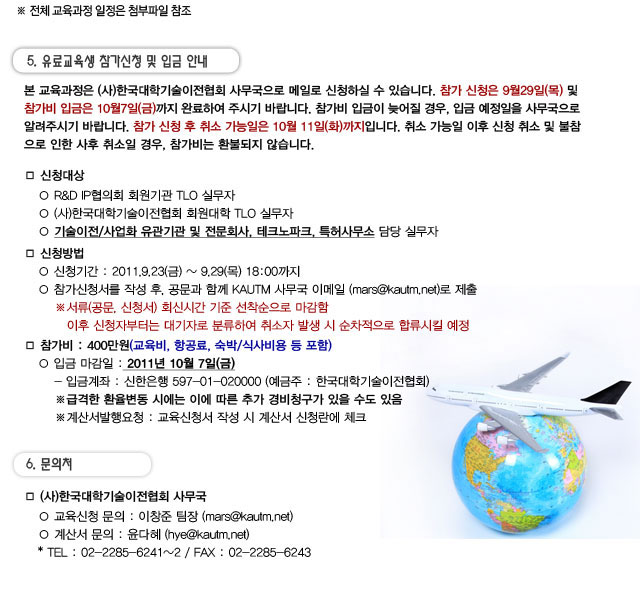 ◎ CCTEC 기술이전 협상 및 계약 - 기술이전 협상의 주요 쟁점 및 방법 - 표준 기술이전 계약서 소개 및 주요 사항 - 실시권 허여 방법과 실시료의 결정 - 보증 및 면책 - 특허비용 부담 방법 - 기업의 실시보고 의무 및 보고서 사례 - 실시 기업 감사 - 실시료의 징수 - 기술이전 계약의 해지 절차와 사례 - 기술의 보증 및 면책 사항 - 코넬 명칭 및 상표의 사용 - 대표적 기술이전 성공 사례 |