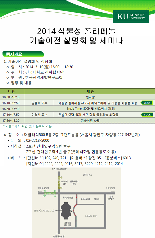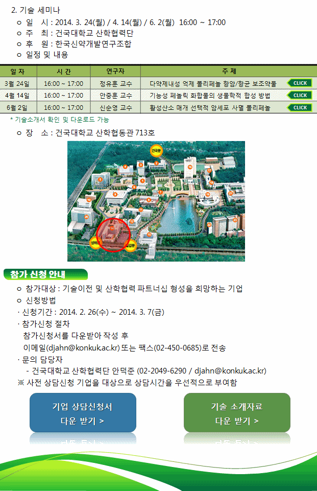 행사배경 : 이번 행사는 본교의 폴리페놀 연구팀(5분 교수님)의 일부기술에 대하여 수요업체와 기술이전에 대한 논의가 있었고, 그 기업에서 기술세미나를 요청한 상태였고, 대학원생 수업이 잡혀있는 관계로 그 수업을 확장해서 기업에 홍보하여 마케팅 행사를 겸하자는 아이디어에서 하게 되였습니다. 또한, 지재연의 발명인터뷰 IP사업화과제 대상기술이기에 사전 마케팅 의미도 있구여.