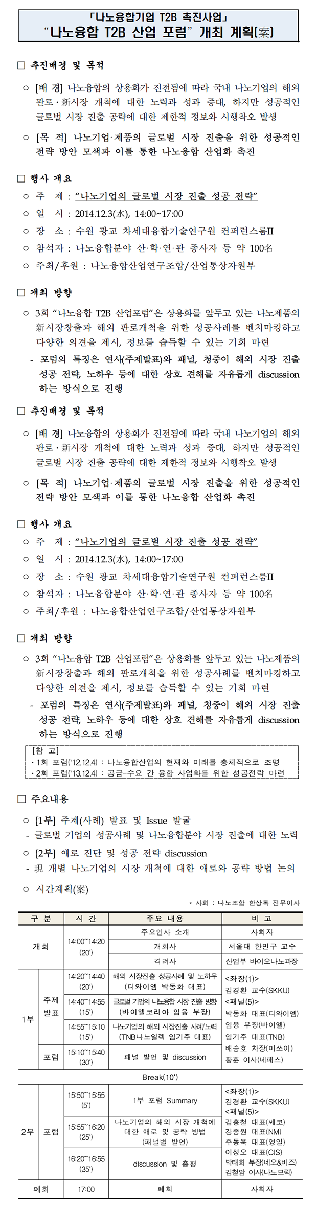 「나노융합기업 T2B 촉진사업」"나노융합 T2B 산업 포럼" 개최 계획(案)