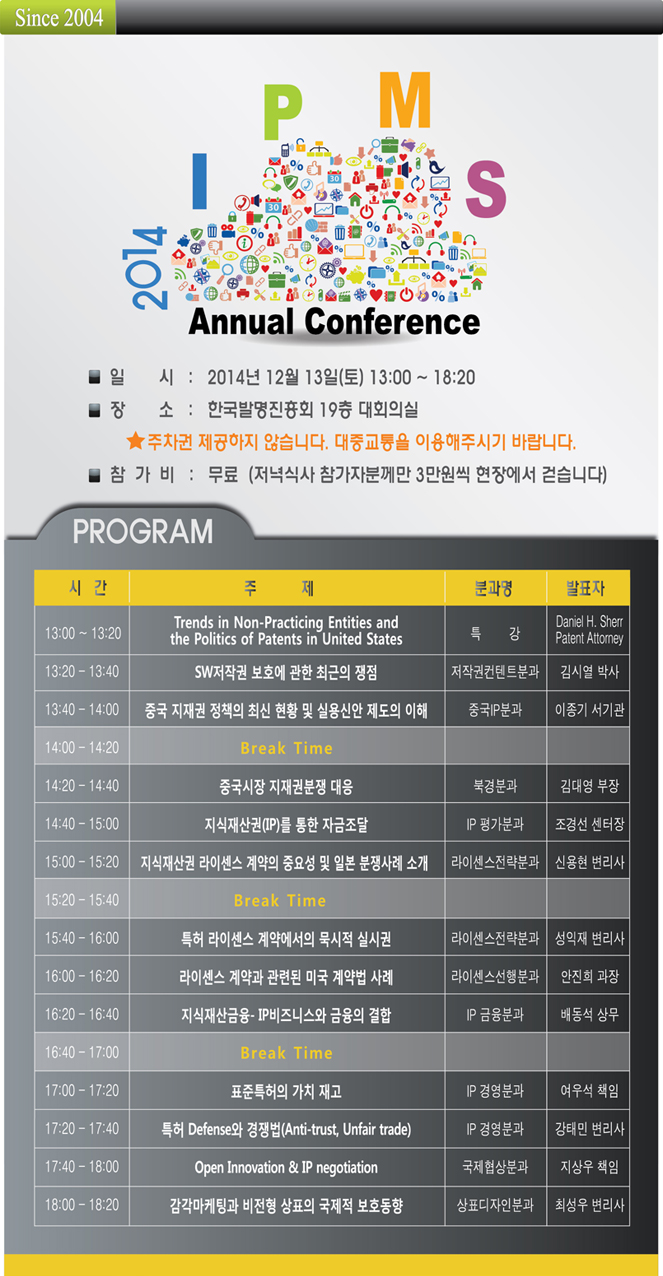 올해도 어김없이 IPMS Annual Conference를 개최합니다. 올해는 참가비가 전혀없는 "무료" 컨퍼런스를 진행합니다. 지식재산의 형태와 활용방법이 많은 변화를 가져 오고 있습니다. 아마도 이러한 이슈와 정보를 가장 쉽고 가까운 곳에서 접할 수 있는 기회라고 생각합니다. 카우터머들의 많은 관심 부탁드립니다.